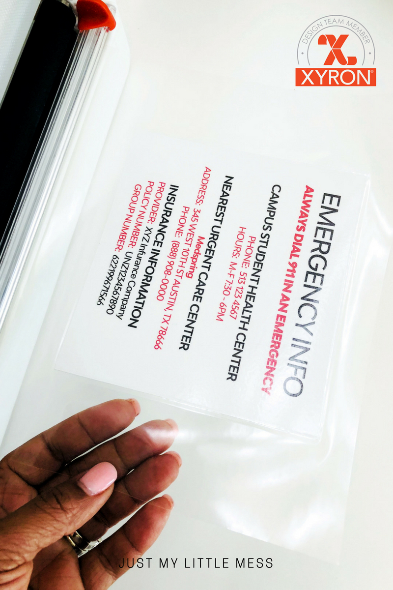 Xyron has amazing products - well, we all know this already. One item they carry I don't use enough personally is the Double Sided Laminate. And boy, I needed it this week to create an Emergency Card Card for my daughter heading off the college.